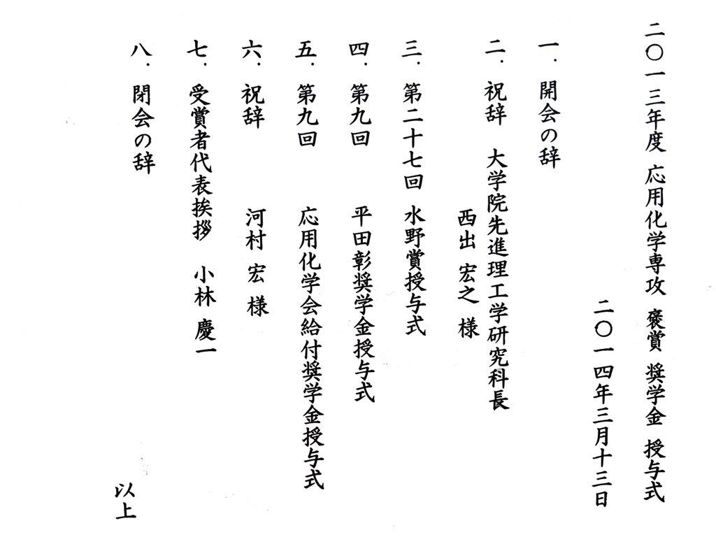 先ずは、桐村主任教授はじめ関根教授ほか授与式をご準備いただいた皆様、本当に有難うございます。本年は応用化学専攻で6名の方について、先進理工学研究科における学位の授与を了承または認めるプロセスが既に完了しており、またパラレルに水野賞に相応しいかどうかについての応用化学専攻の教室でのご判断と合わせて本日の表彰に至りましたこと博士号の授与と合わせて本当におめでとうございますと申しあげます。これは皆様のご苦労、そしてご家族の支援、また、同僚そして指導の先生方のご尽力によるものであることはいうまでもありません。