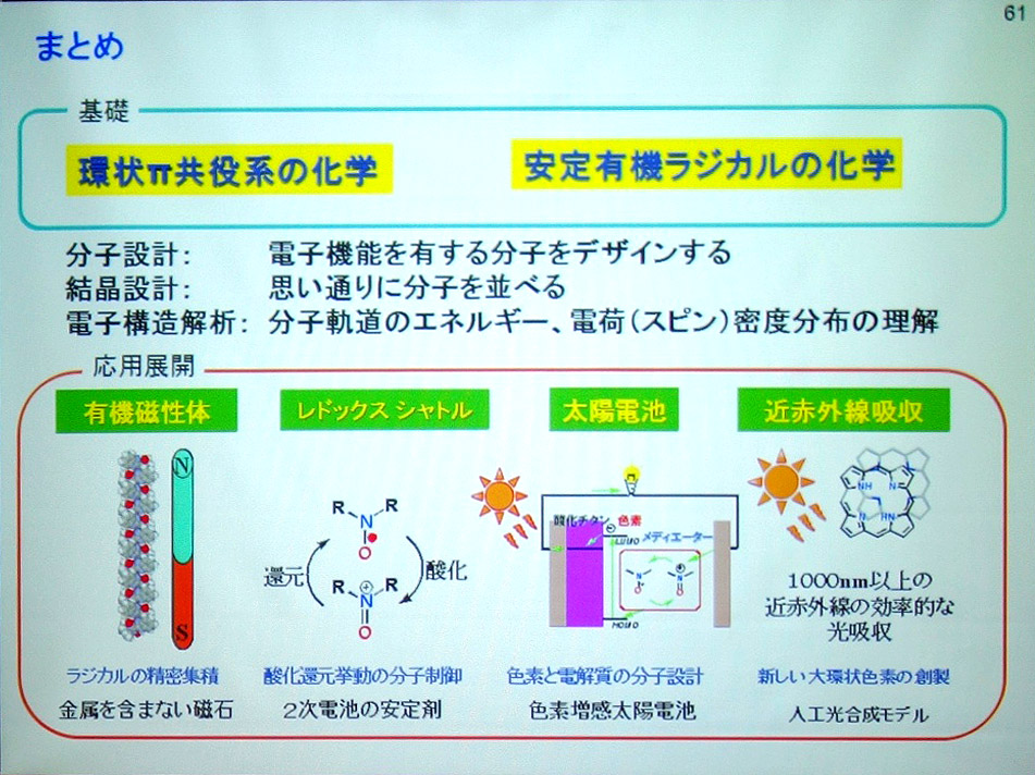 本間敬之教授から講師略歴(付表)および研究の専門分野で、特に、安定ラジカルですとかポルフィリンといった共役系の結合をもった分子の中のπ電子の機能に着目して単分子あるいはその分子集合体での高度な機能発現というところで分子の合成、設計から機能発現まで幅広く研究をされておられる旨の紹介がありました。